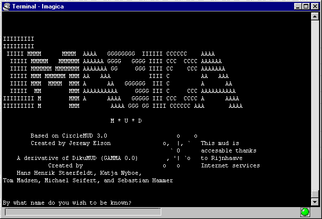If you do not know how to connect to a server by Telnet, then read on. If you already know how to connect, then connect to jimagica.net : 4000 (port 4000) As told before, you connect to the MUD by a telnet session. This can be easy or really hard, if your Webbrowser is setup properly, it will be really easy. You will find at the main page of the Imagica MUD Homepage a telnet picture, if you klick the picture, and your Webbrowser is setup correctly, you will end up with a telnet session with the Imagica Server. If not you must find a telnetprogram, I you do not have one yet, download one. Next connect to the Imagica server. The telnet program will ask for an IP-adress, for the Imagica MUD this is jimagica.net, if there is a special textbox which asks for a Port number, you must fill in 4000 there. If there is no special Portbox, you must enter jimagica.net:4000 as IP- adress. A server has several Portnumbers. Behind each of them can run a program. Our MUD porgram runs at the server behind port number 4000. Tip: If you run Windows, you can try EWAN. It’s a really nice telnetprogram. It has a scroll- back, meaning you can scroll back the screen if the text ran over your screen too fast. Further it supports ANSI color. This means you can get the MUD tekst in few colors. This will make playing much friendlier. How to know if you are connected