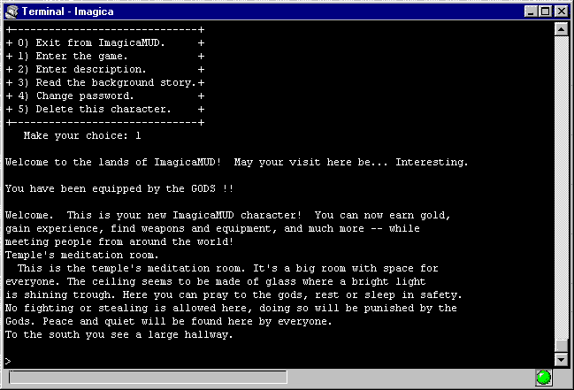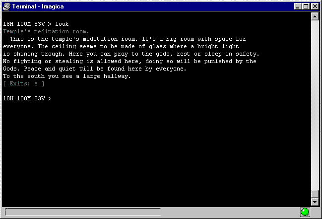 (Back to index)Ofcourse I could ask you to read the Frequently Asked Questions first, but i will explain in short. MUD stands for Multi User Dimension (or Dungeon). Maybe you played on your old Commodore 64 games like 'the Hobbit', if so, you're going to love this. It's all about text adventures. You are walking in a living book. You walk through a world described by text. Everything is there, everything is described by text. You will become thirsty, hungry, you will be hurt, you might be able to use magic or some devastating fighting techniques and i promise, you will die several times (Yes, I know this sounds weird) One of the most important sides of playing MUD is being with a great number of people in the same game. You can talk, fight together, go explore the world together, learn from eachother about the world of Imagica MUD, it’s a social event. A MUD is a program that runs on a Computer that is connected to the Internet, you use a telnet session to connect to it and play. It's all about text Why text ?