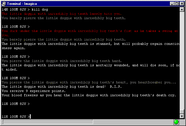 (Back to index)First find a computerplayer, the dog is a safe monster to start with. You need to walk around till you see a dog, when you find him, look at him by look dog When you feel like chopping hm to pieces, type cons dog to make see what your chances are against him in combat. If you think you have a good chance to kill him, type kill dog Next there will be some text scrolling what resembles the fight. Every line is a slash from the dog or from you. Also the lines will tell you how hard the stroke was and how much damage it did. Keep your eye at your Hitpoints. ![]() [FIGHT PICCY] When you killed a monster, you will get experience points. To loot the corpse type get all corpse You probably will get some meat from the dogs corpse, Type score to get more info about the points you need to gain a higher level. About Staying Fit - Eating and Drinking: